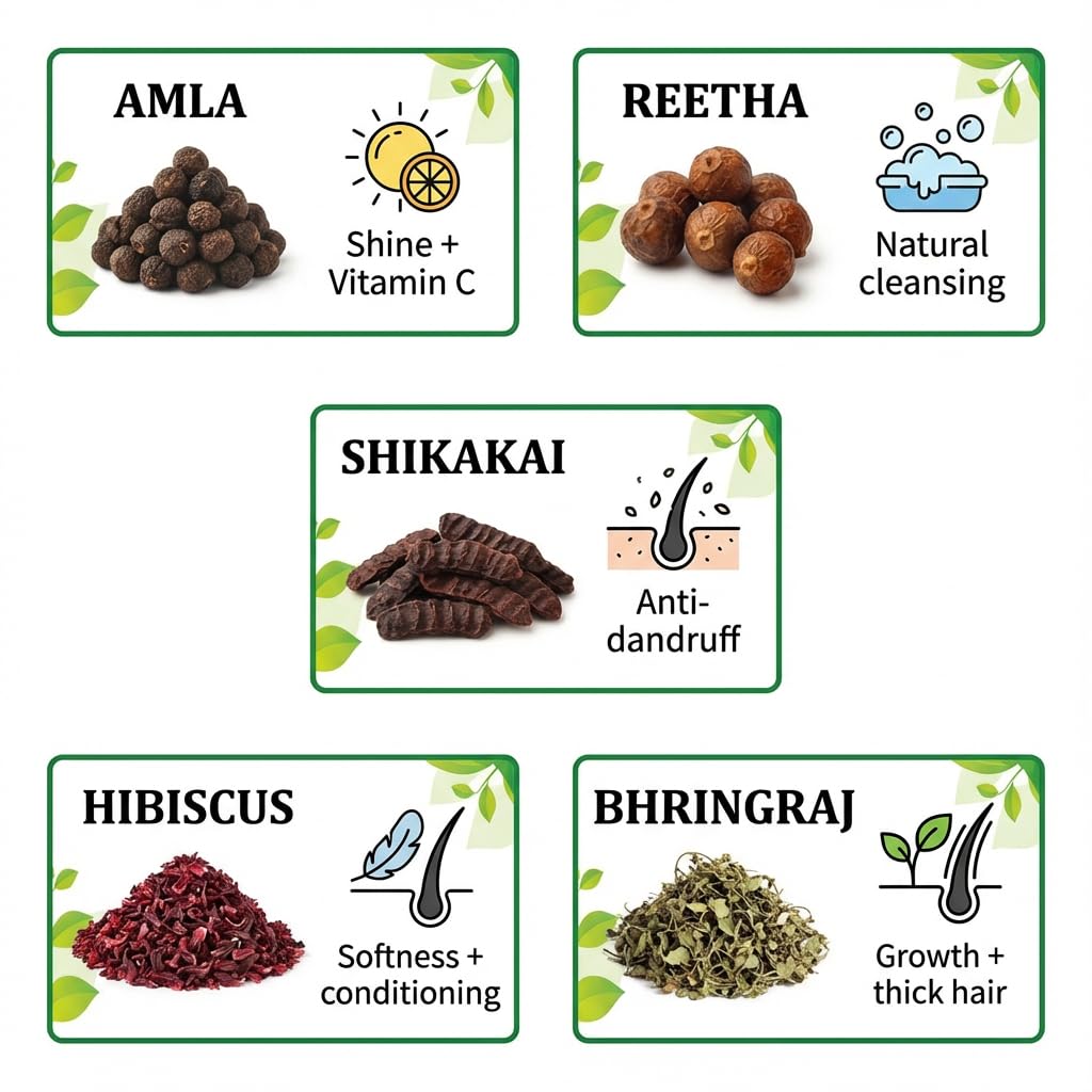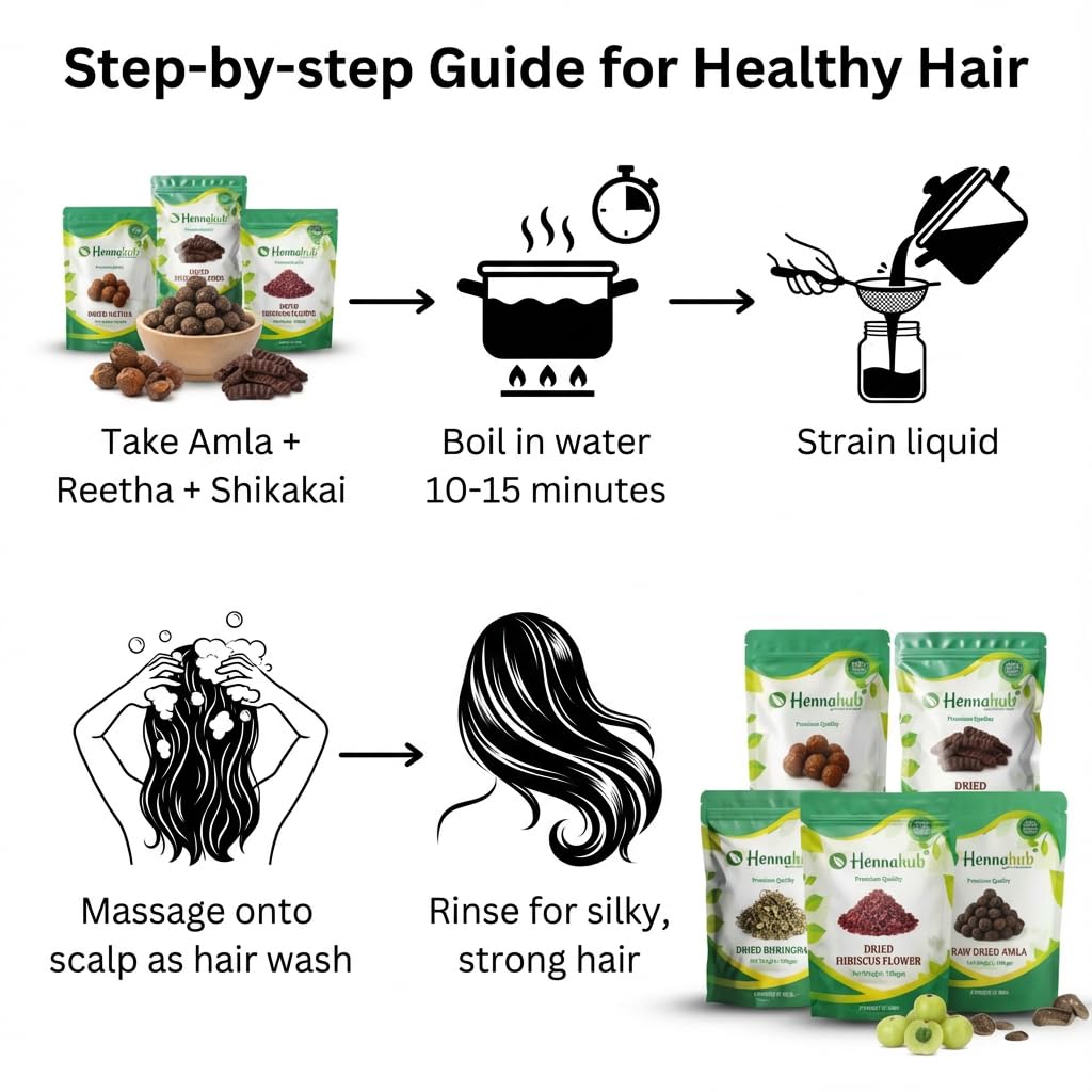 Give your hair a natural makeover with the Hennahub Complete Hair Care Raw Herb Combo . This pack includes five time-tested Ayurvedic herbs — Raw Dried Amla, Reetha, Shikakai Pods, Dried Hibiscus Flower and Dried Bhringraj , each 100g. Together, they offer a traditional, chemical-free solution for cleansing, nourishing and rejuvenating your hair.