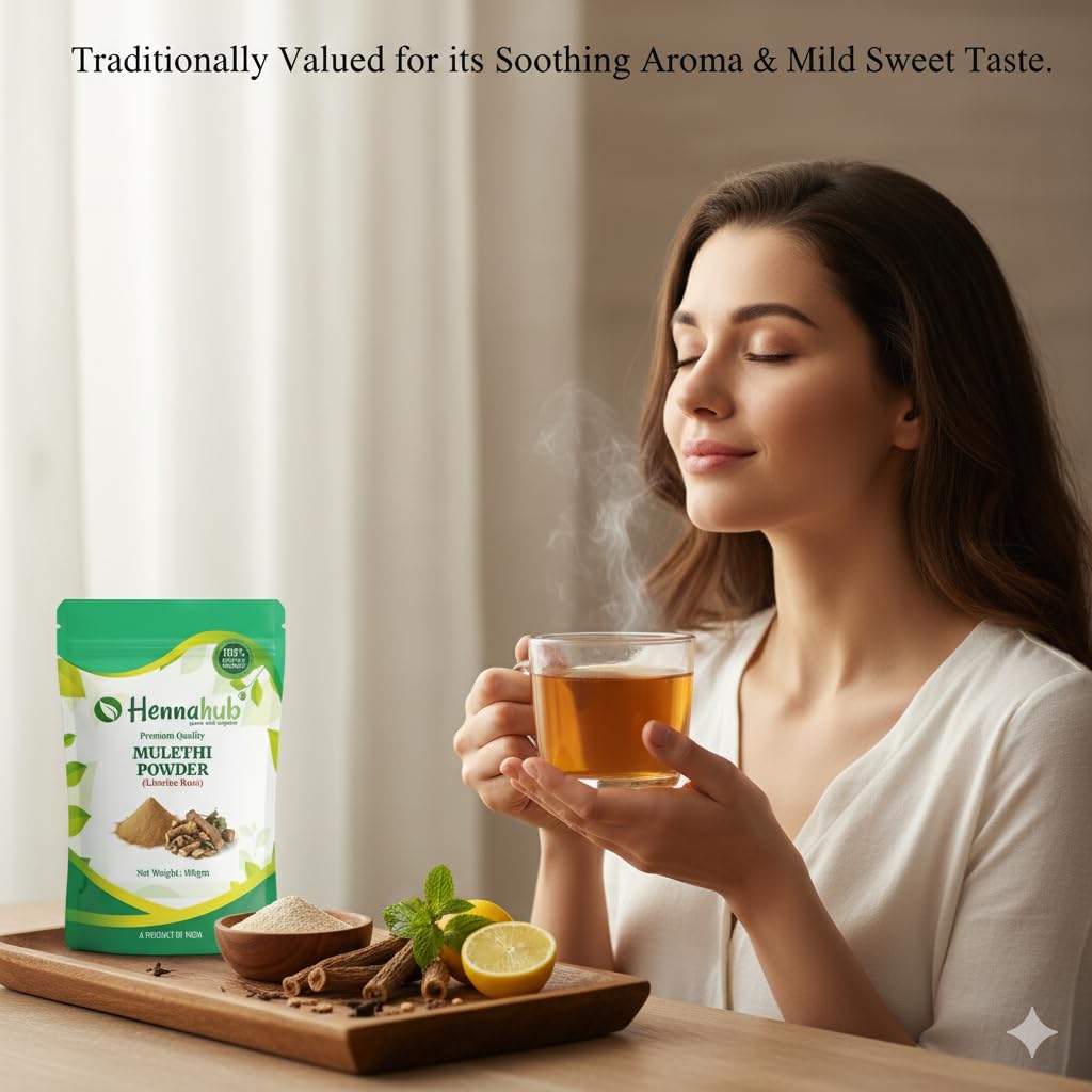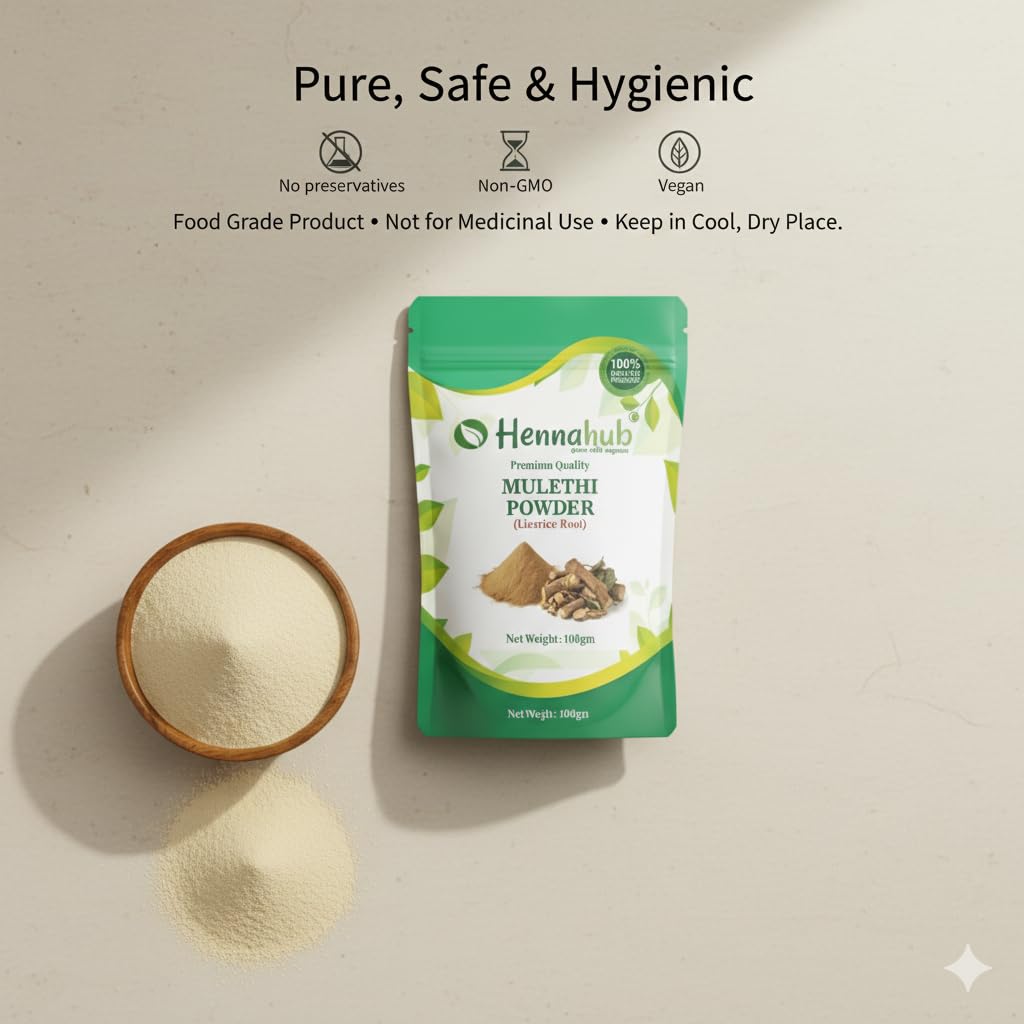Hennahub Mulethi Powder (Food Grade) 100gm Pack is made from 100% pure and naturally sun-dried roots of Glycyrrhiza glabra (Licorice Root). It's a versatile, plant-based ingredient with a mild sweet taste, suitable for teas, herbal drinks, or food recipes.