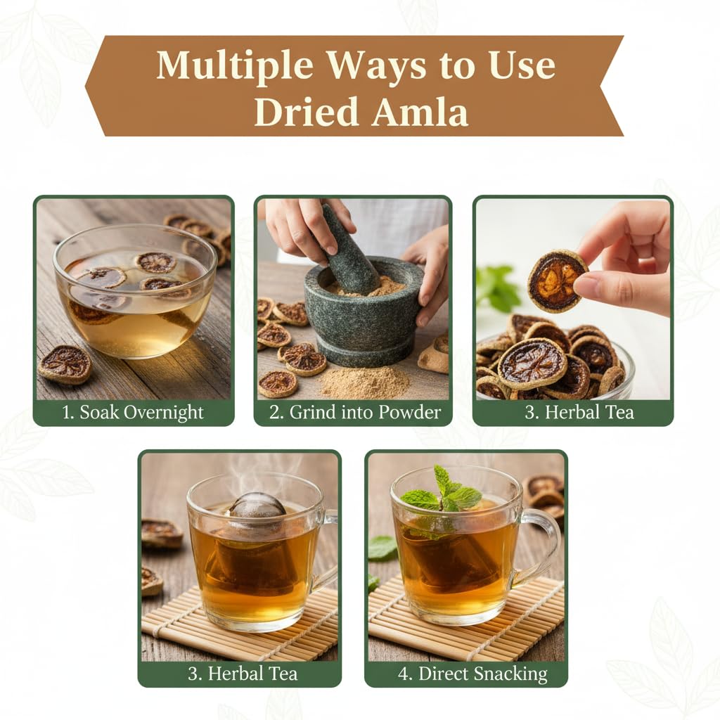 Soak the dried amla slices overnight and use the water for hair rinse or face pack. You can also grind them into powder for herbal mixes or consume directly as a tangy superfruit snack.