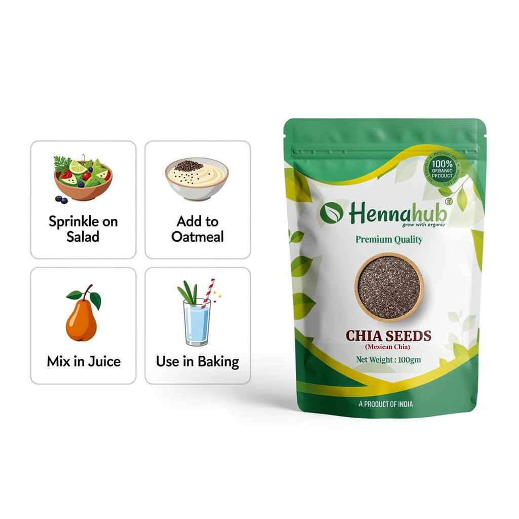 Hennahub Premium Chia Seeds 100g | Raw & Unroasted | Omega-3, Fibre & Protein-Rich Superfood | Gluten-Free Seeds for Smoothies, Puddings, Weight Loss, Salads & Daily Nutrition